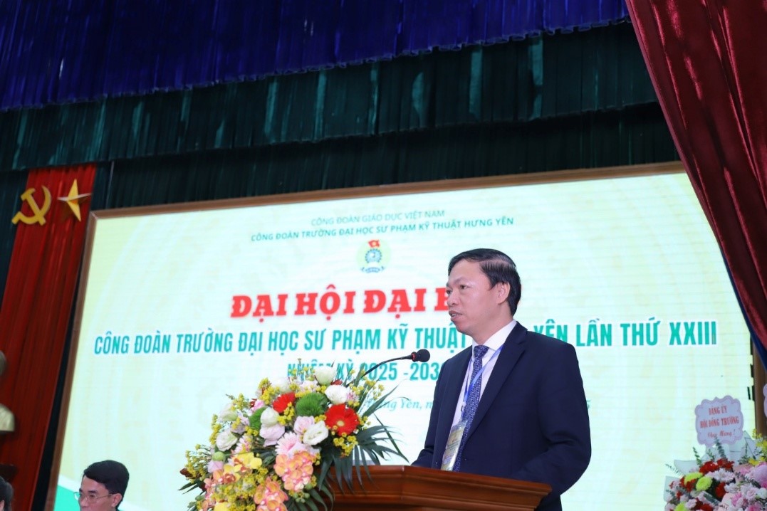Phát biểu chỉ đạo đại hội, PGS. TS Bùi Trung Thành – Phó bí thư Đảng ủy, Hiệu trưởng Nhà trường khẳng định: vai trò của Công đoàn trường trong xây dựng môi trường làm việc đoàn kết, dân chủ, sáng tạo; đồng thời tin tưởng rằng với tinh thần “Đoàn kết – Đổi mới – Trách nhiệm”, Công đoàn sẽ tiếp tục phát huy kết quả đạt được và đồng hành cùng Nhà trường trong thực hiện các mục tiêu chiến lược.